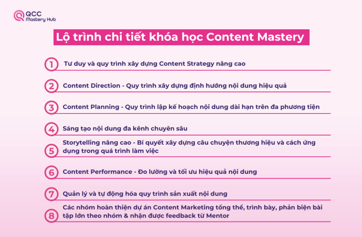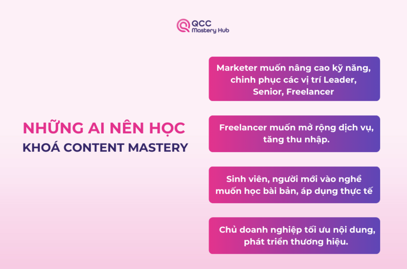 Nếu bạn muốn nâng tầm kỹ năng Content Marketing, xây dựng chiến lược bài bản và tối ưu hiệu suất công việc thì đừng bỏ lỡ khóa học Content Mastery (chèn link đăng ký) tại QCC – Nơi giúp bạn làm chủ chiến lược nội dung, tối ưu quy trình và là trợ thủ đắc lực giúp bạn dễ dàng thăng tiến trong ngành và sẵn sàng bứt phá sự nghiệp ngay trong năm 2025.
